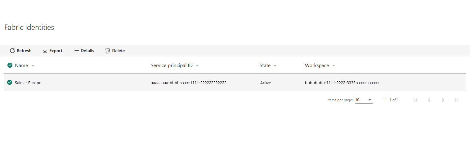 Na guia Identidades do Fabric, você verá uma lista com todas as identidades do Fabric em seu locatário.