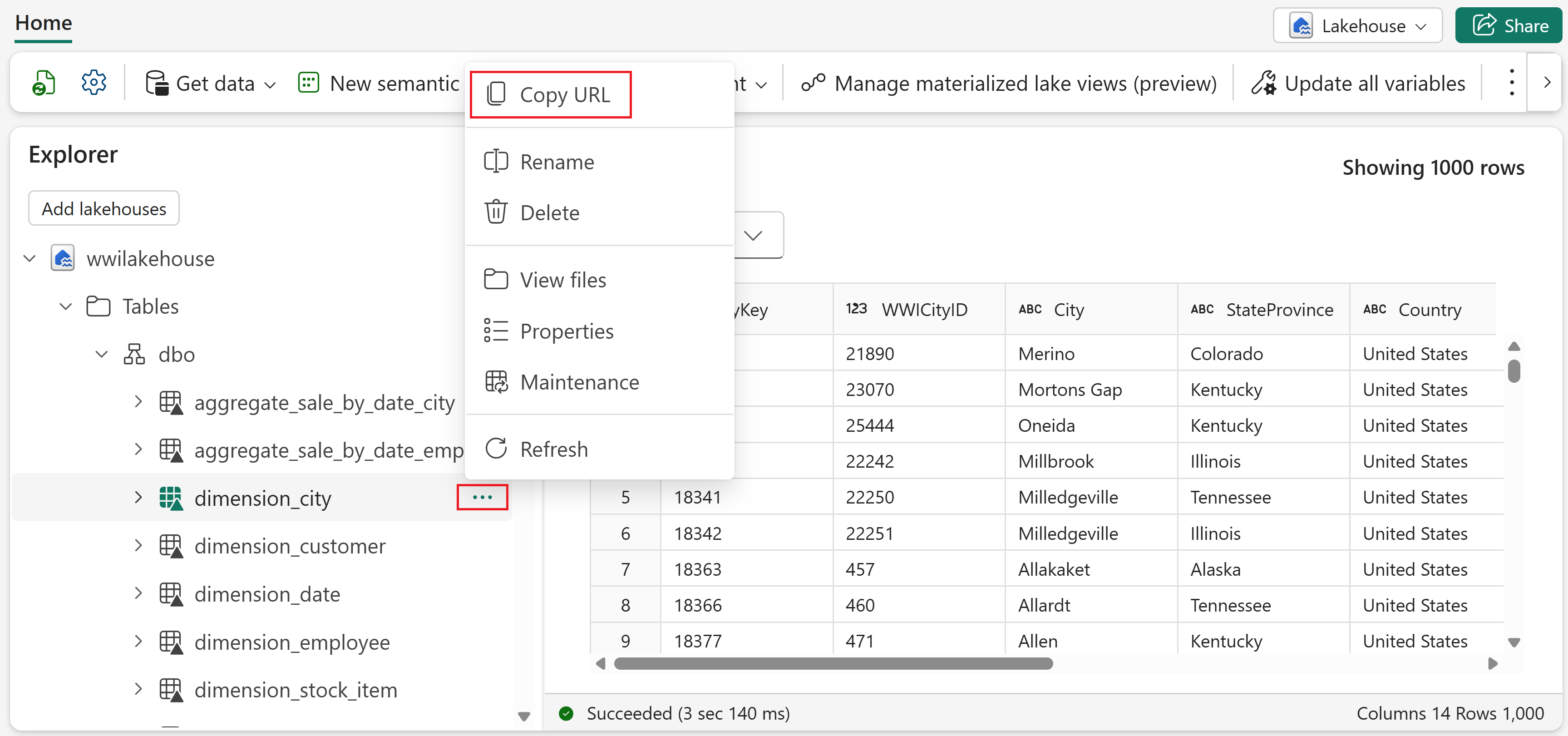 Você pode gerar uma URL exclusiva para qualquer tabela para que outras pessoas possam abrir o Lakehouse Explorer com essa tabela já visualizada. Selecione ... ao lado da tabela e escolha Copiar URL.