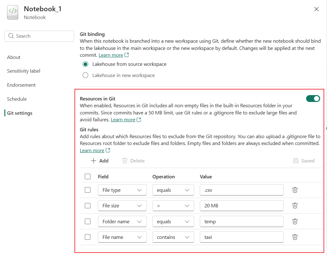 Esse recurso é opcional e desativado por padrão. Habilite-o nas configurações do Notebook na seção de configurações do Git. Depois de habilitá-lo, os arquivos na pasta Recursos são incluídos em confirmações. Como os commits têm um limite de 50 MB, utilize regras de arquivos ou do Git para excluir arquivos ou pastas grandes ou temporárias.