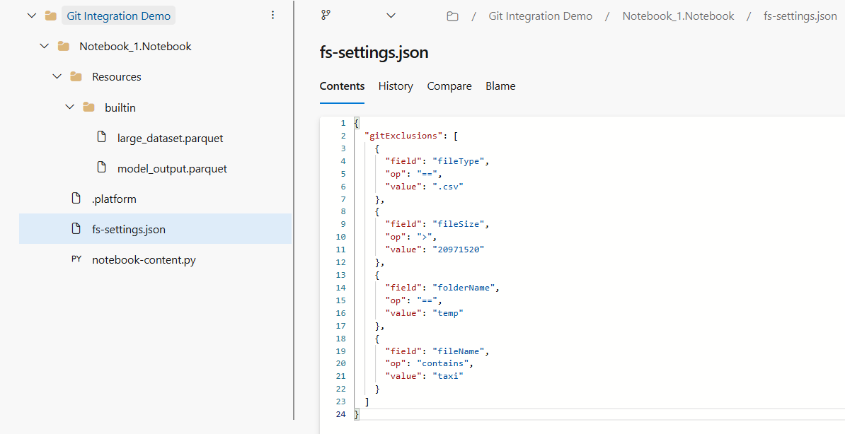 Depois de configurar regras do Git e confirmar alterações, o Fabric salvará as regras no fs-settings.json repositório. O Fabric gera e gerencia esse arquivo para manter a configuração do repositório consistente. Também não recomendamos editar esse arquivo diretamente no repositório Git.