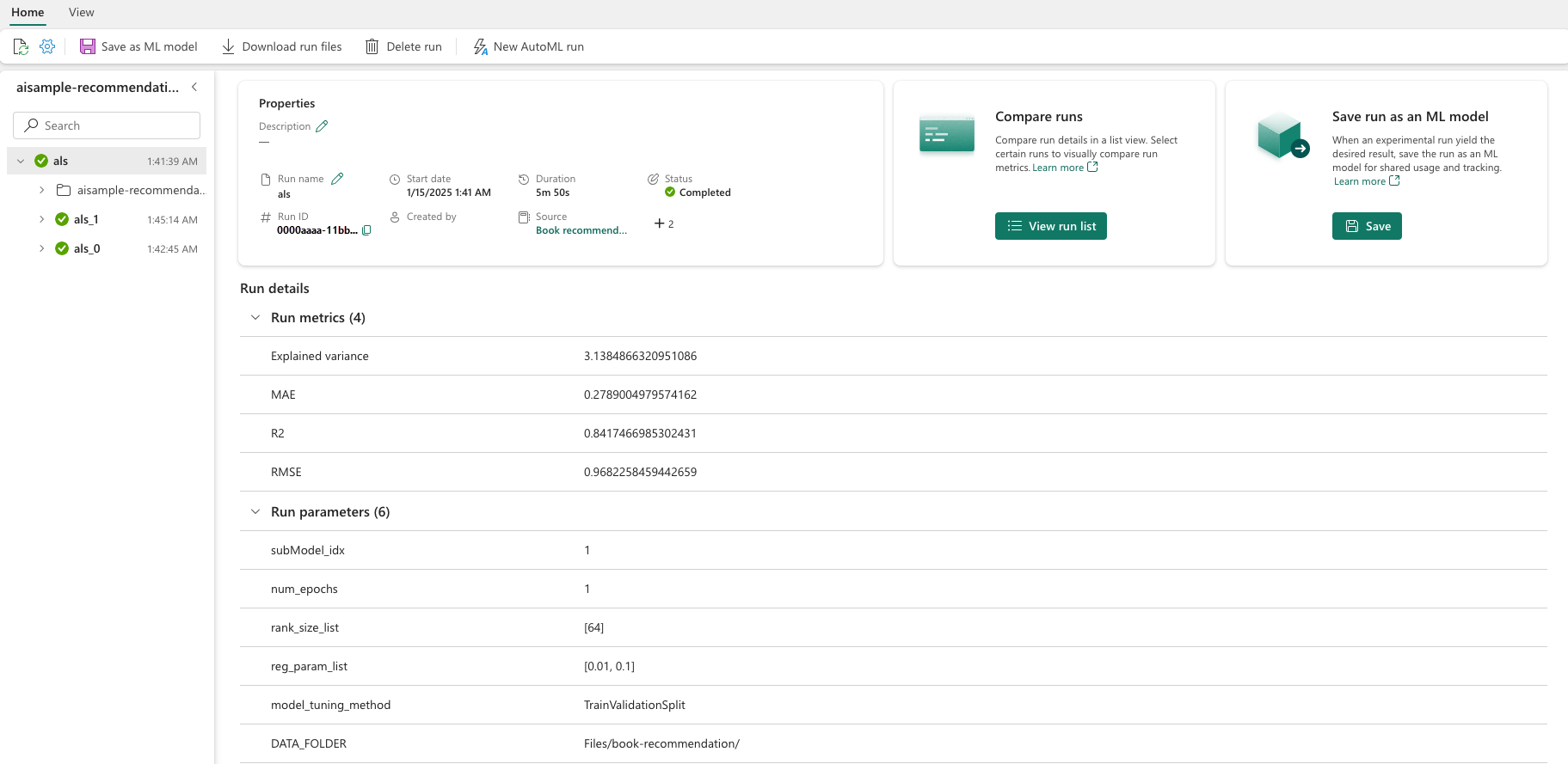 Selecione o experimento chamado aisample-recommendation em seu workspace para exibir as informações registradas em log para a execução de treinamento. Se você alterar o nome do experimento, selecione o experimento que tem o novo nome. As informações registradas se assemelham a esta imagem: