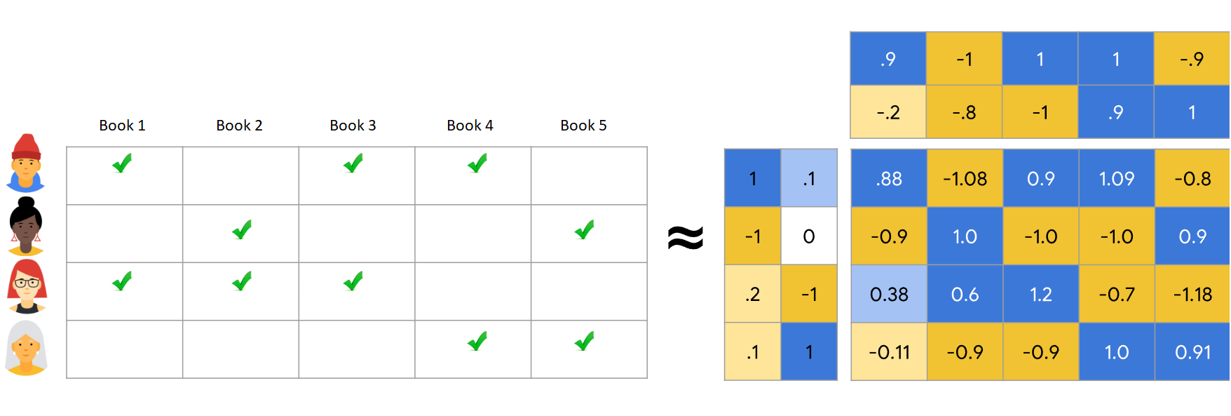 ALS tenta estimar a matriz de classificações R como o produto de duas matrizes de menor ordem, U e V. Aqui, R = U * Vt. Normalmente, essas aproximações são chamadas de matrizes de fator.