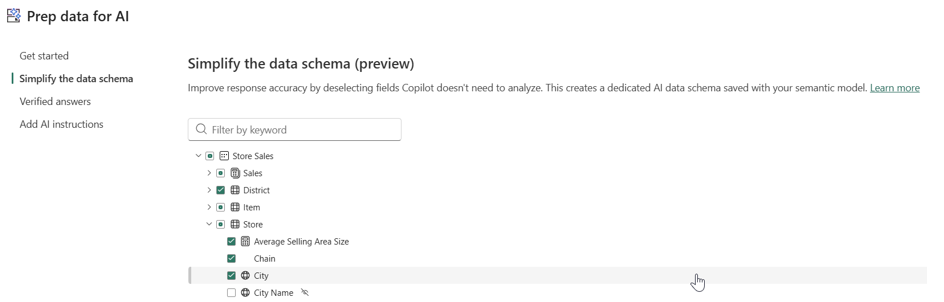 Você pode configurar esse esquema no Power BI Desktop ou no serviço do Power BI selecionando dados de preparação para IA na faixa de opções Home. Em seguida, navegue até a guia Simplificar esquema de dados . A partir daí, selecione quais tabelas, colunas e medidas a IA deve usar ao gerar respostas. Para obter instruções detalhadas de instalação, consulte Definir um esquema de dados de IA.