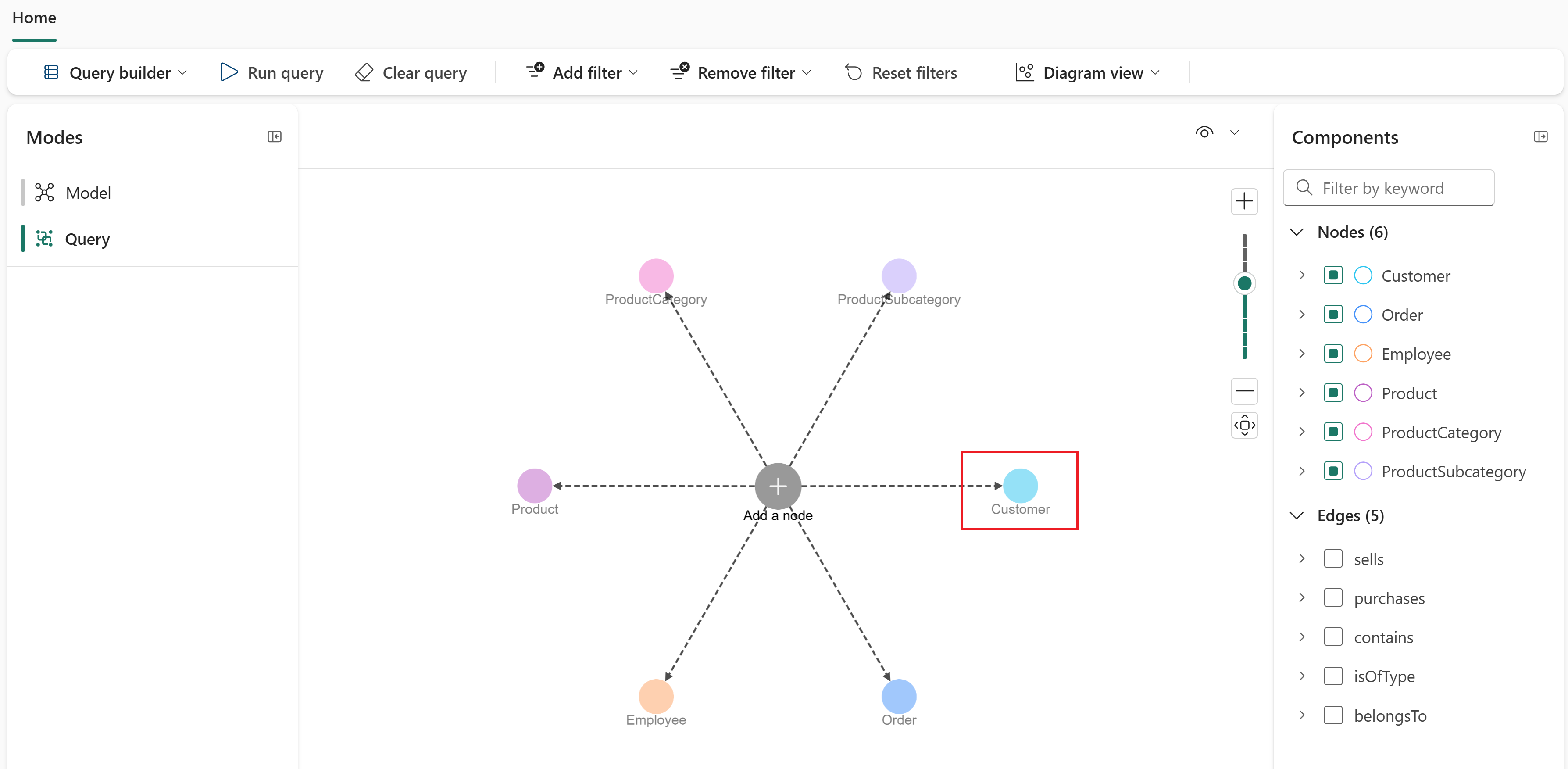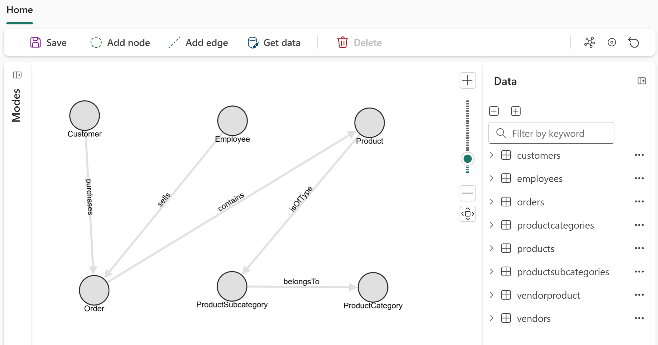 Agora você pode iniciar a modelagem adicionando nós e bordas ao grafo. Usamos o modelo de dados do Adventure Works como exemplo.