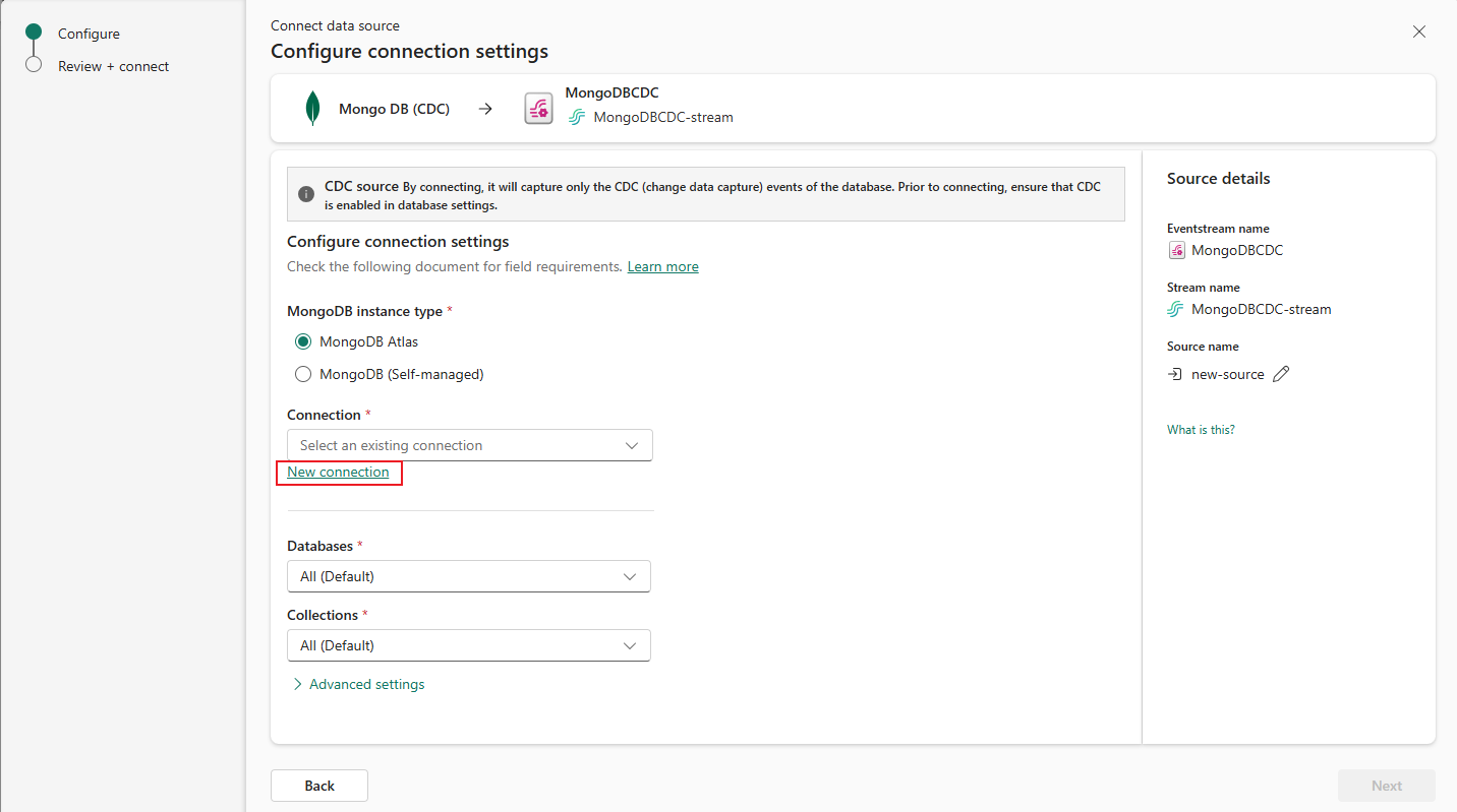 Insira as informações a seguir para configurar a fonte de dados CDC do MongoDB e selecione Avançar.