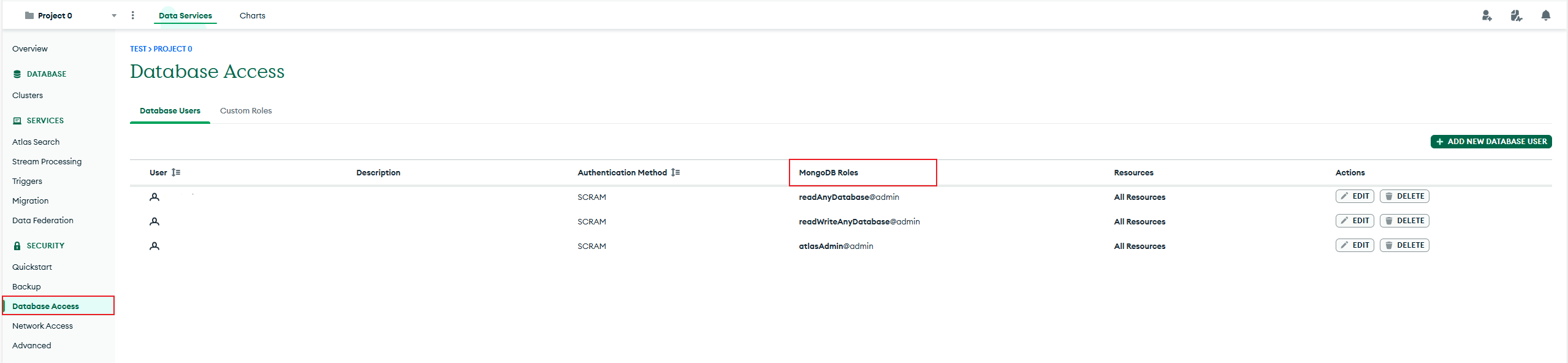 Você também deve criar ou usar um usuário existente do MongoDB com a read função (ou superior) no banco de dados de destino. No MongoDB Atlas no MongoDB Cloud, acesse o Acesso ao Banco de Dados para verificar a função do usuário.