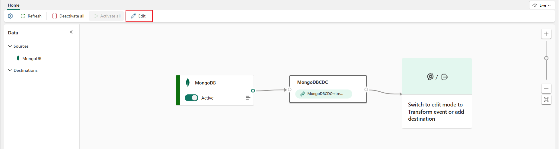 Você verá a origem do MongoDB (CDC) adicionada ao fluxo de eventos no modo de Edição.