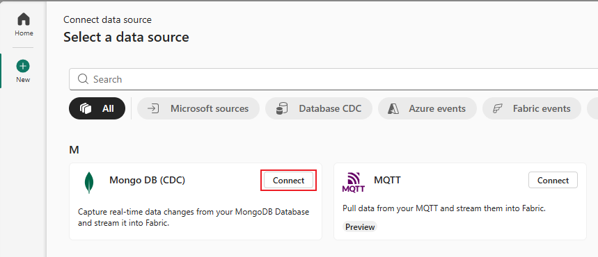 Na página Selecionar uma fonte de dados , pesquise e selecione Conectar no bloco do MongoDB (CDC ).