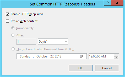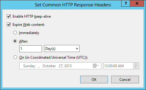 Na caixa de diálogo Definir Cabeçalhos comuns de resposta HTTP, marque a caixa para expirar o conteúdo da Web, selecione a opção para expirar após um intervalo específico ou em um horário específico e clique em OK.