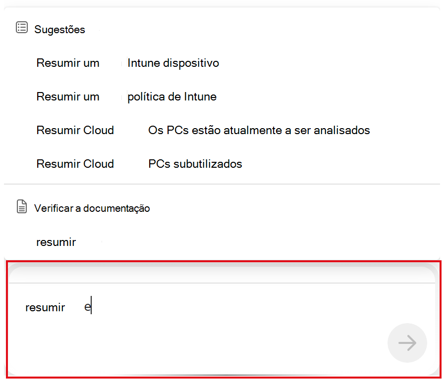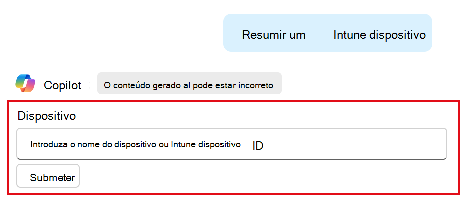 Se um pedido exigir mais informações, ser-lhe-á pedido que introduza essas informações. Por exemplo, se selecionar a sugestão Resumir um dispositivo Intune, ser-lhe-á pedido para introduzir o ID do dispositivo: