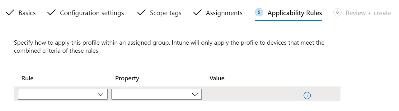 As regras de aplicabilidade permitem aos administradores definir como destino os dispositivos de um grupo que atenda a critérios específicos. Por exemplo, cria um perfil de restrições de dispositivos que se aplica ao grupo Todos os dispositivos Windows . E você só deseja que o perfil seja atribuído a dispositivos que executam o Windows Enterprise.