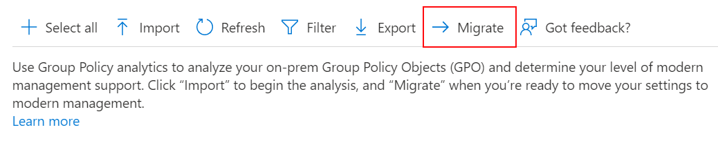 Para obter os passos específicos, aceda a Importar e analisar os GPOs no local com Política de Grupo análise no Intune.