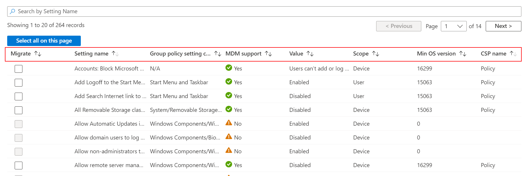 Depois de importar os GPOs, reveja as definições que podem ser migradas. Lembre-se de que algumas definições não fazem sentido em pontos finais nativos da cloud, como dispositivos Windows. Depois de as rever, pode migrar as definições para uma política de Catálogo de Definições.