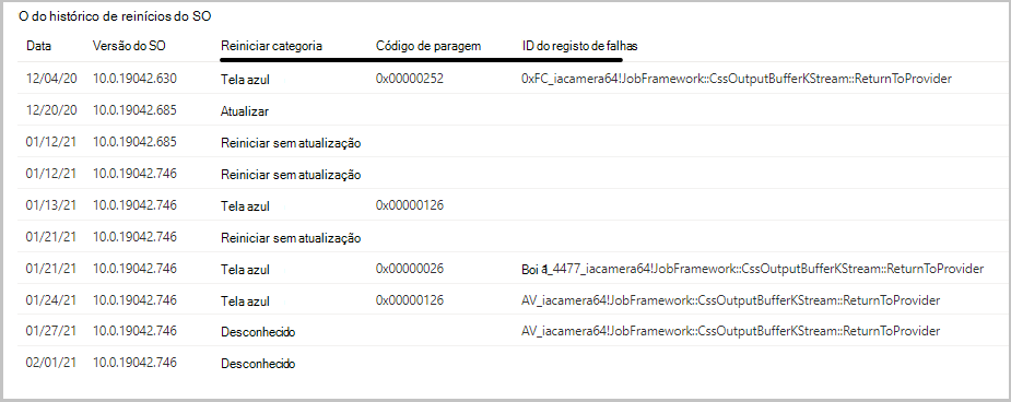 A tabela histórico de reinícios do SO mostra os 10 reinícios mais recentes que ocorreram nos últimos 30 dias. Uma vez que esta tabela é atualizada com baixa latência, os novos reinícios são normalmente apresentados aqui antes de serem apresentados nas agregações diárias no separador Desempenho do dispositivo .