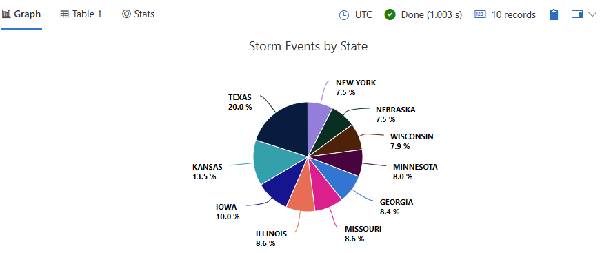 Essa consulta fornece uma representação visual dos 10 principais estados com o maior número de eventos storm, exibidos como um gráfico de pizza
