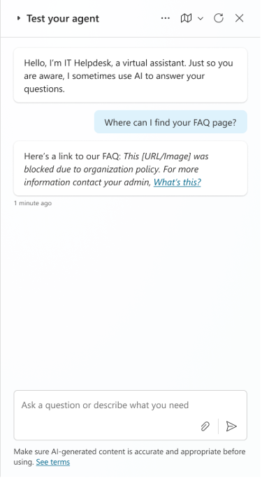 Copilot Studio fornece aos administradores controle sobre como imagens e URLs inseridas aparecem nas respostas do agente. Com a capacidade de permitir imagens e URLs, você pode: