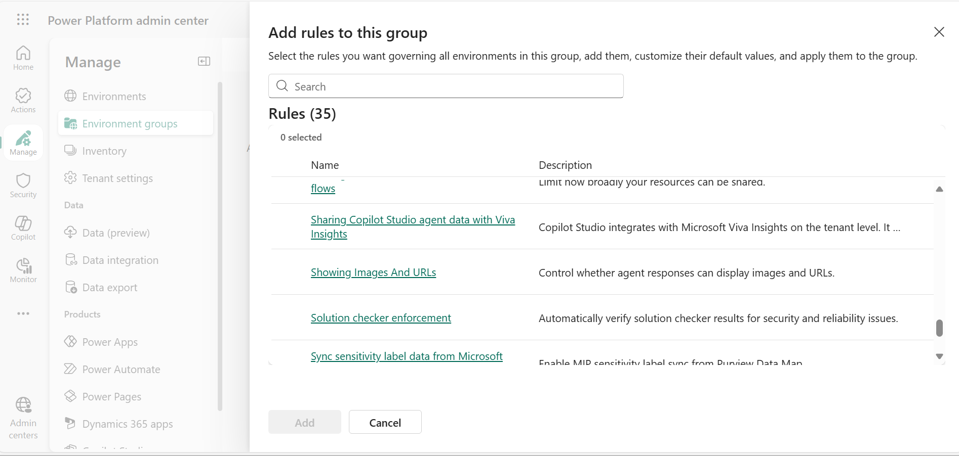 Grupos de ambiente: No Power Platform Admin Center, navegue até Gerenciar>Grupos de ambiente>Regras>Mostrando imagens e URLs.