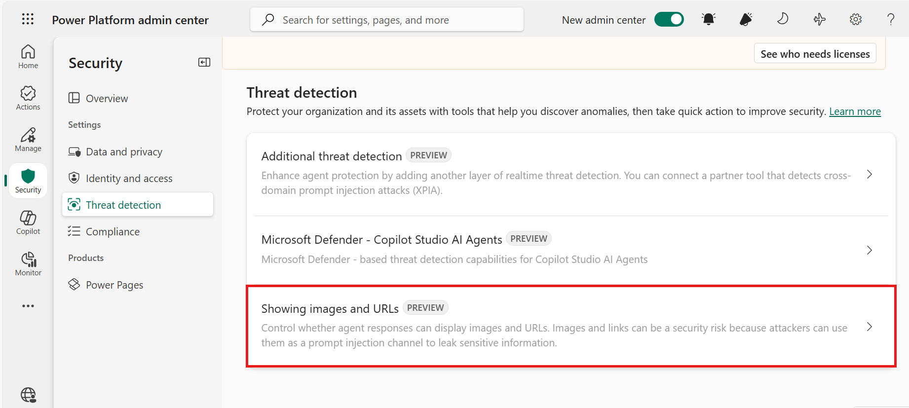 Centro de segurança: No Centro de Administração da Power Platform, navegue até Segurança>Detecção de Ameaças>Mostrando imagens e URLs. Selecione Permitir imagens e URLs ou Bloquear todas as imagens e outras URLs para habilitar ou desativar a renderização de imagens e URLs para um ambiente ou grupo de ambiente específico.