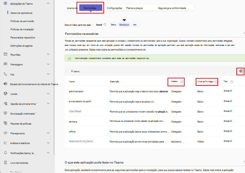 As permissões permitem que as aplicações acedam a recursos privilegiados e atuem em nome do utilizador. Esta capacidade permite que os programadores criem funcionalidades avançadas em aplicações que aumentam a produtividade dos utilizadores. Tem de compreender claramente as permissões, o âmbito e as implicações. No centro de administração do Microsoft Teams, pode rever os riscos de permissão da aplicação e os níveis de privilégios. Também pode ver detalhes sobre o que cada aplicação pode fazer no Teams. Para obter mais informações, veja Ver riscos de permissão da aplicação e níveis de privilégios.