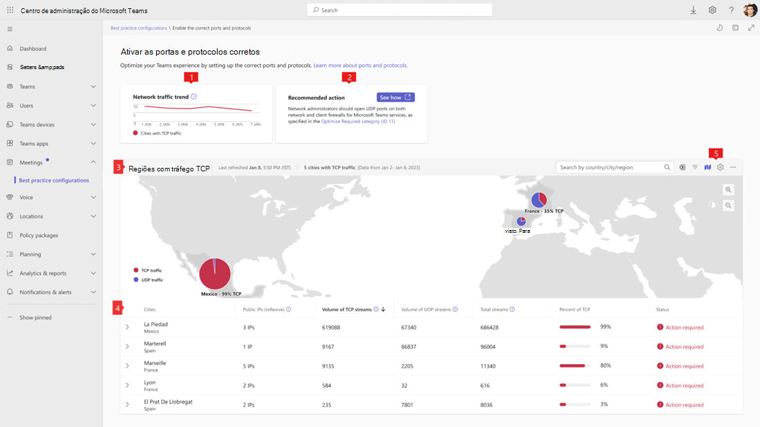 Os fluxos de multimédia no dashboard ativar as portas e os protocolos corretos refletem as comunicações multimédia do Teams realizadas através do Protocolo de Controlo de Transmissão (TCP) em vez do Protocolo UDP (User Datagram Protocol). Este dashboard realça as localizações que têm uma elevada proporção de fluxos com TCP.