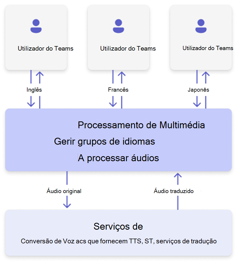 - Um bot transmite áudio da reunião para processamento baseado na nuvem e devolve traduções instantaneamente.