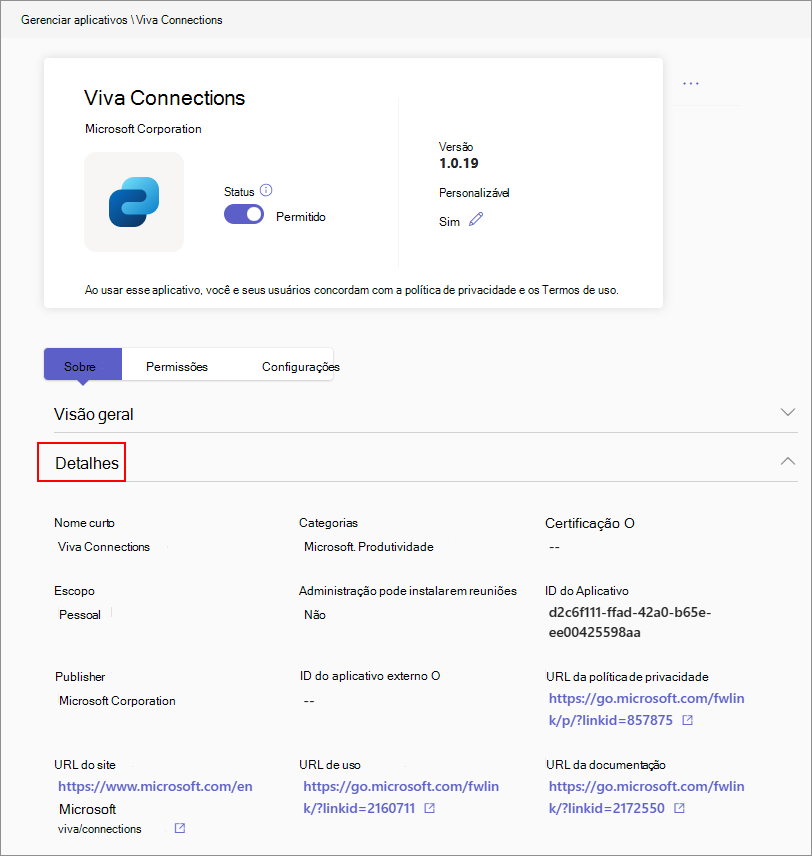 - Página de detalhes da aplicação na página Gerir aplicações no centro de administração do Teams.