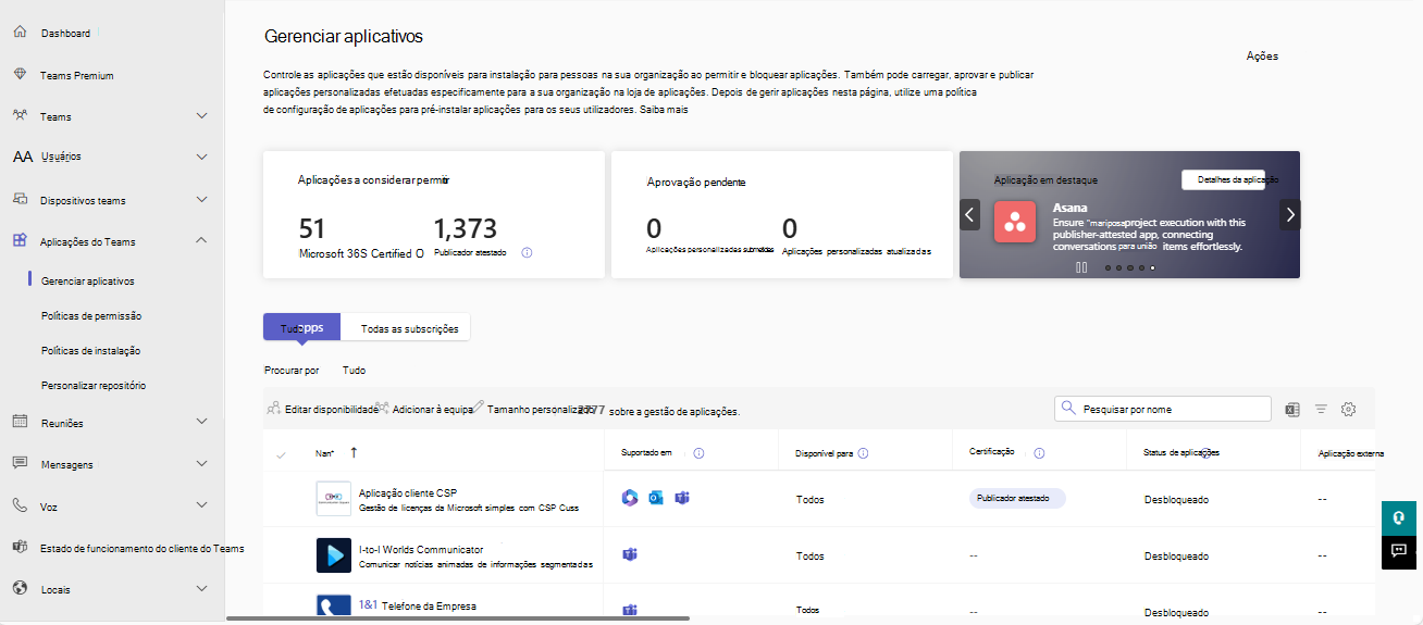 | Controle que agentes e aplicações estão disponíveis para os utilizadores na sua organização ao permitir e bloqueá-los. Também pode carregar e aprovar aplicações e agentes personalizados. Depois de gerir agentes e aplicações nesta página, pode utilizar políticas de permissão e configuração de aplicações para configurar que agentes e aplicações estão disponíveis para utilizadores específicos na loja de aplicações e no agente da sua organização. | Gerenciar aplicativos no Centro de administração do Teams | Artigo atual |