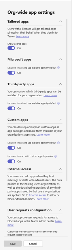 | Os seus utilizadores podem adicionar agentes e aplicações quando organizam reuniões ou conversas com convidados. Também podem utilizar agentes e aplicações partilhadas por convidados quando participam em reuniões ou chats alojados externamente. São aplicadas as políticas de dados da organização do utilizador anfitrião e as práticas de partilha de dados de quaisquer agentes e aplicações de terceiros partilhados pela organização desse utilizador. | Acesso externo | Comportamento do aplicativo, dependendo dos tipos de usuários |