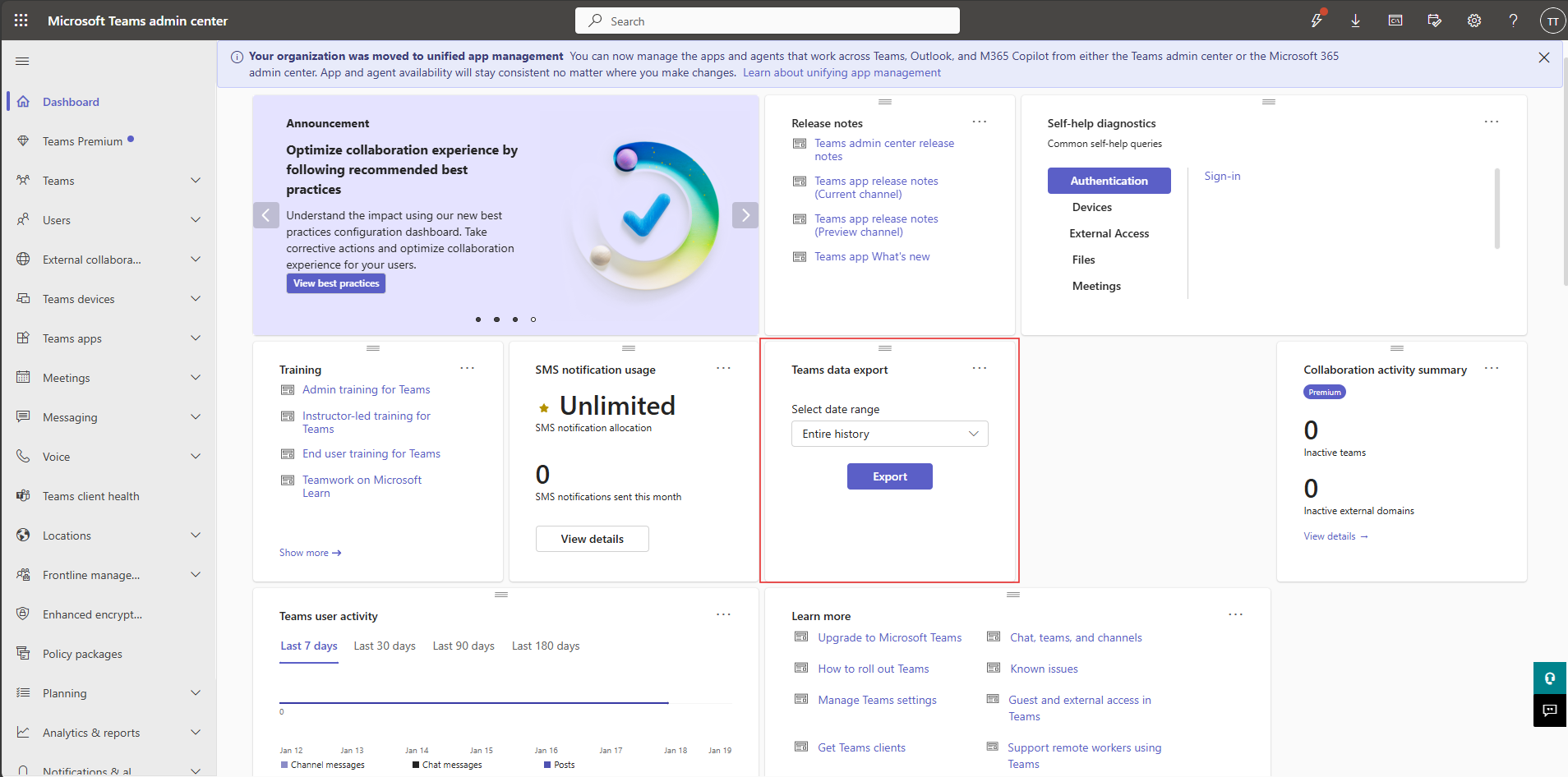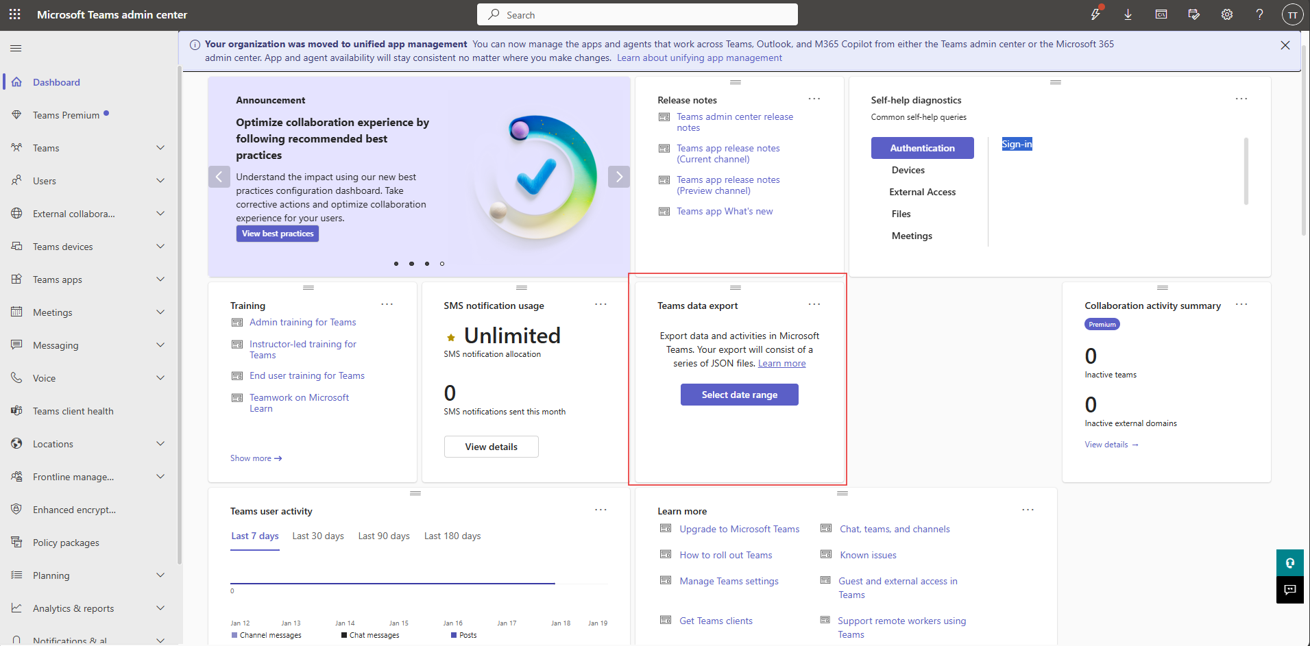 Localize a ferramenta de exportação de dados do Teams no centro de administração do Teams. Inicie sessão no centro de administração do Microsoft Teams como Administrador Global. No Dashboard, localize o card de exportação de dados do Teams.