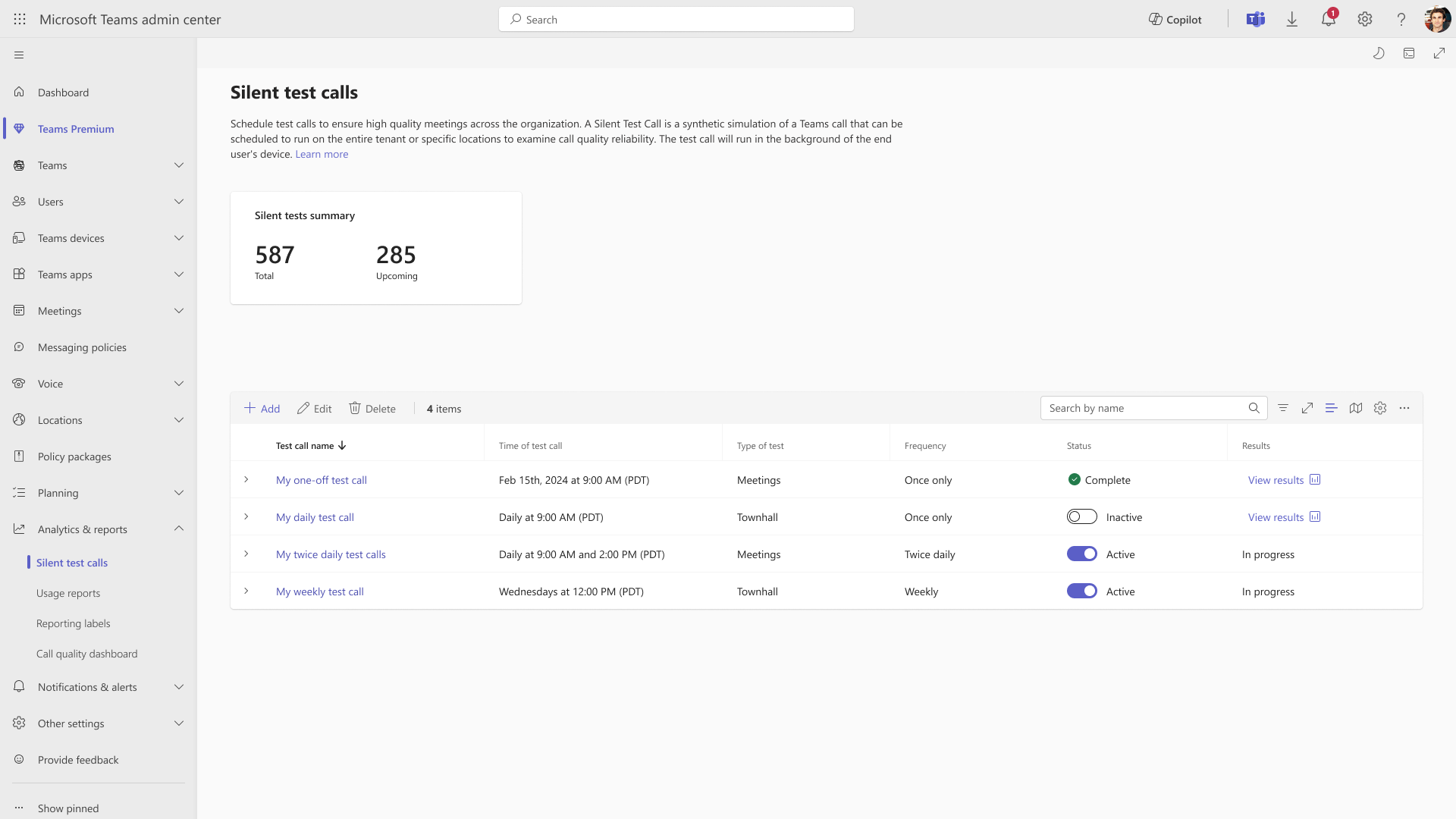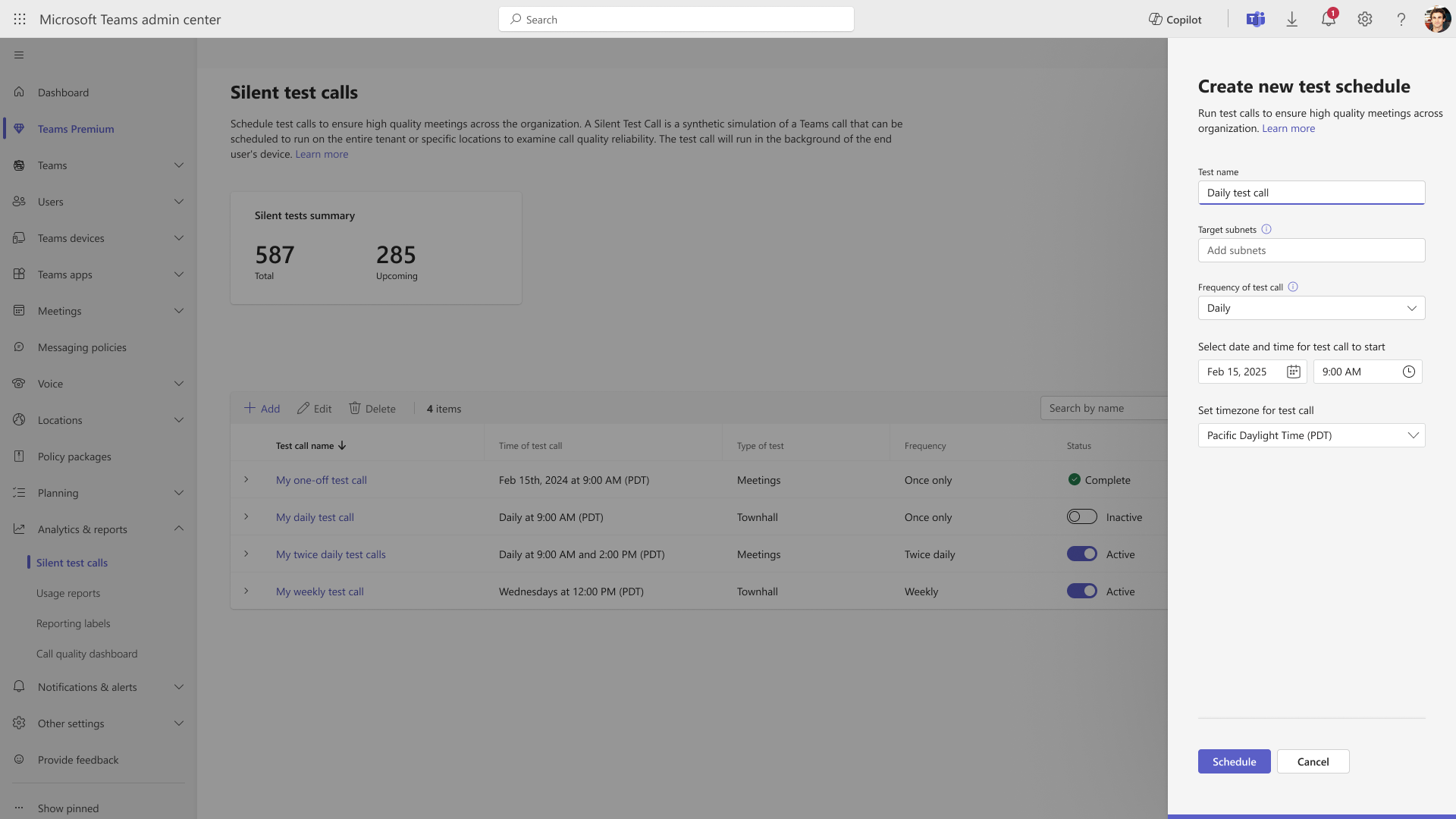 - Durante a pré-visualização pública, todos os inquilinos participantes podem aceder e agendar ambos os tipos de Testes Silenciosos, independentemente do licenciamento Teams Premium.