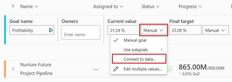 - Conecte o valor atual, o valor de destino ou ambos aos dados em um relatório existente do Power BI.