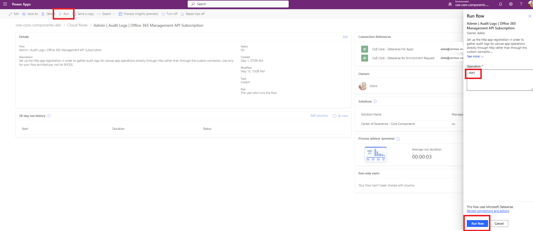 Ative o fluxo Administrador | Logs de Auditoria | Assinatura da API de Gerenciamento do Office 365. Execute o fluxo inserindo iniciar como a operação a ser executada.