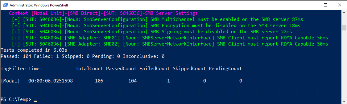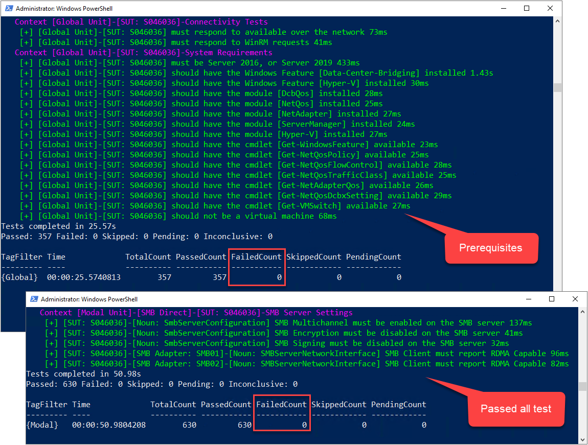 This example shows successful scan results of a single server for all prerequisites and modal unit tests by indicating a Failed Count of 0.