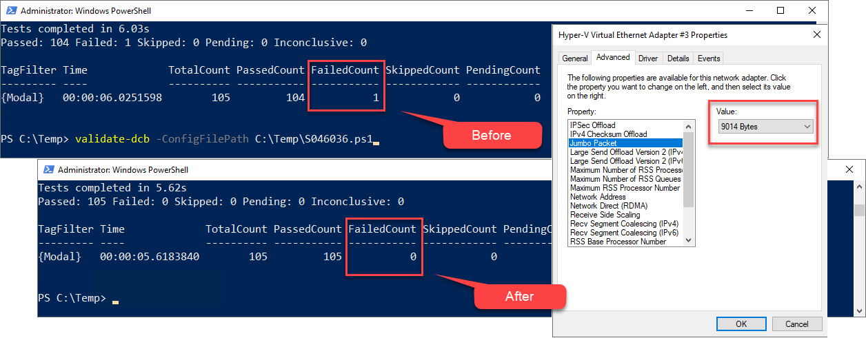 Fixing the error requires enabling the Jumbo Packet feature and changing its size to 9014 bytes. Running the scan again on host S046036 confirms this change by returning a Failed Count of 0.