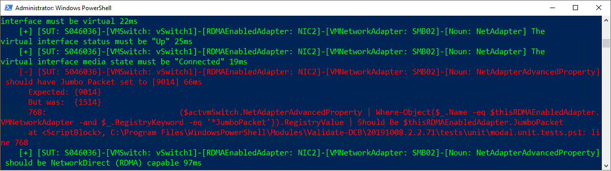 Scrolling back through the results shows an error in red indicating that the Jumbo Packet for vNIC SMB02 on Host S046036 is set at the default size of 1514, but should be set to 9014.