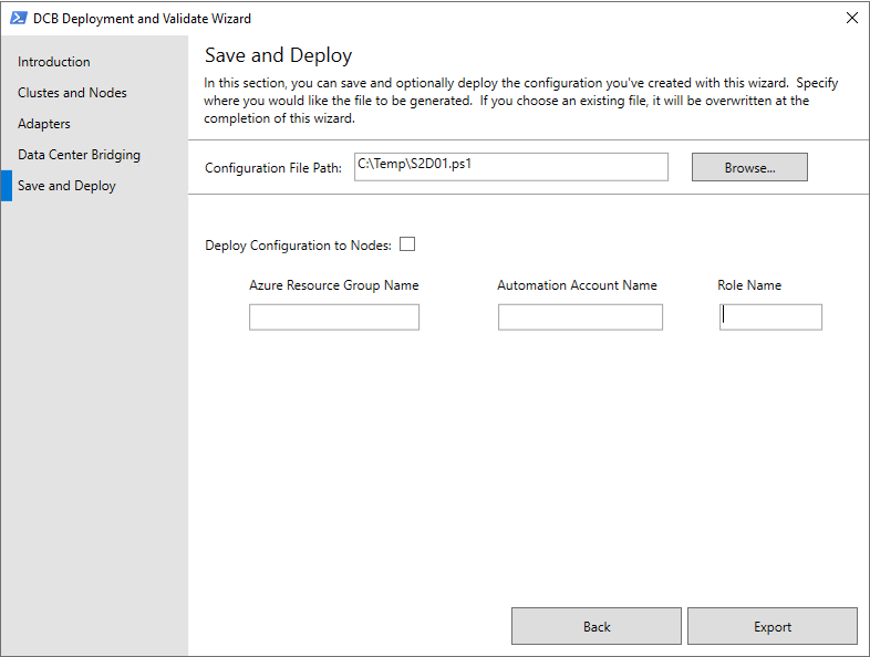 On the Save and Deploy page, in the Configuration File Path box, save the configuration file using .ps1 extension to a location where you can use it again later if needed, and then select Export to start running the Validate-DCB tool.
