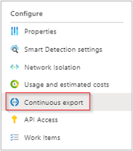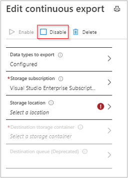 A exportação contínua não está disponível para recursos baseados em workspace, e deve ser desabilitada. Quando a migração for concluída, você poderá usar as configurações de diagnóstico para configurar o arquivamento de dados em uma conta de armazenamento ou streaming dos Hubs de Eventos do Azure.