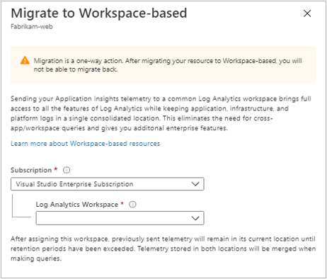 O processo de migração é permanente e não pode ser revertido. Depois de migrar um recurso para o Application Insights baseado em espaço de trabalho, ele sempre será um recurso baseado em espaço de trabalho. Depois de migrar, você poderá alterar o espaço de trabalho de destino sempre que necessário.