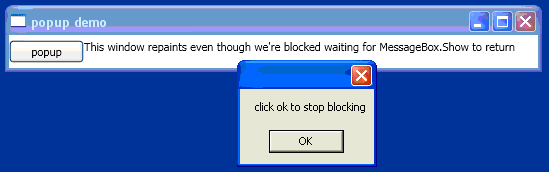Sometimes it’s not feasible to completely lock up the UI thread. Let’s consider the Show function of the MessageBox class. Show doesn’t return until the user clicks the “ok” button. It does, however, create a window that must have a message loop in order to be interactive. While we’re waiting for the user to click “ok” the original application window does not respond to user input. It does, however, continue to process paint messages. You’ll notice that the original window redraws itself when covered and revealed.