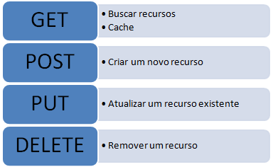 As chamadas às URIs são realizadas através de verbos HTTP. O verbo utilizado na requisição indica para o serviço que ação deve ser realizada com o recurso, os verbos mais comuns para serem utilizados com o REST são GET, POST, PUT e DELETE. O verbo GET indica que o cliente quer obter uma representação de somente leitura do recurso. O POST é utilizado para criar um novo recurso. O PUT é tipicamente utilizado na atualização de um recurso existente. Já o DELETE, como o próprio nome indica, é utilizado para excluir um recurso existente. Um resumo do uso dos verbos é demonstrado na figura 1.