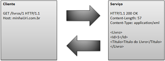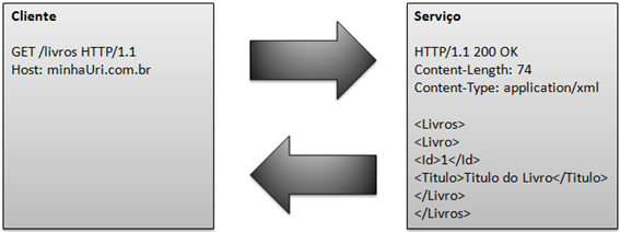 Usando os princípios de funcionamento do REST, veremos um exemplo da interação que ocorre entre o cliente e o serviço. O exemplo deste cenário é um serviço de cadastro de livros de uma biblioteca hospedado no endereço minhaUri.com.br.