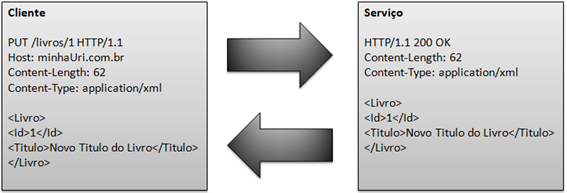 Existindo a necessidade de atualizar um livro já existente, o cliente chama o serviço na URI/livros/1, onde atualizaria o livro com id igual à 1, utilizando o verbo PUT e assim como na inclusão, o serviço também retorna uma instância do recurso atualizado, veja um exemplo na figura 5.