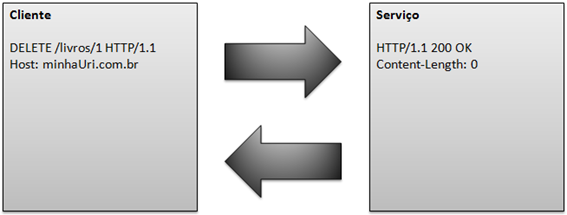 A última ação que o cliente pode fazer é excluir um livro, o que é feito através de uma requisição com o verbo DELETE na URI/livros/1, excluindo o livro de id igual à 1. O exemplo desta última chamada está na figura 6.