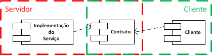 Quando falamos da criação de uma solução com WCF, sempre existe a possibilidade de sermos responsáveis pela criação do código do lado do servidor e também do lado do cliente. Se isto ocorrer, uma boa prática é que a definição dos contratos fique em um Assembly e tanto o serviço quanto o cliente compartilhem este contrato, cada um em seu Assembly correspondente. A figura 7 mostra como seria essa divisão em um diagrama de componentes UML.