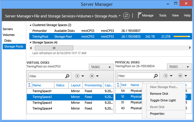 In Server Manager, File and Storage Services, verify the status of the storage pool, the physical disk, and virtual disks (storage spaces) for the storage pool.
