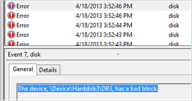 “The IO operation at logical block address <LBA> for Disk <Disk Number> (PDO name: <PDO Name>) failed due to a hardware error.”