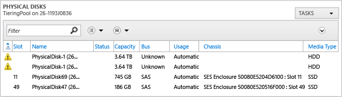 In the PHYSICAL DISKS list, make sure the media type (SSD or HDD) for the replacement disk is displayed. The media type is discovered for all disks that are approved for use with Storage Spaces. If you’re using tiered spaces, the media type determines which tier the disk is added to. If you don't see a media type, work with your vendor to get an approved disk model.