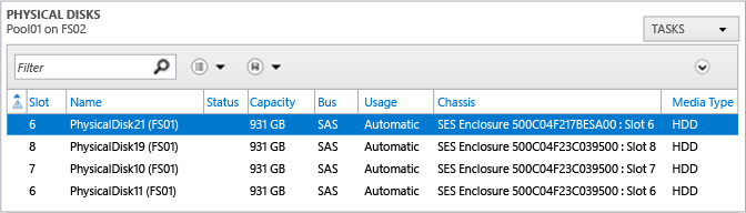 Use only certified SAS-connected JBODs—Those enclosure models have been tested with Storage Spaces and also enable you to easily identify the enclosure and slot for a physical disk, as shown in Figure 1. For a list of certified JBODs, see the Windows Server Catalog.