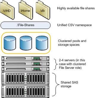 This topic describes how to deploy clustered storage spaces by using Storage Spaces and Failover Clustering in Windows Server 2012. Together, these technologies provide a resilient, highly available, and cost-efficient solution that you can scale from simple deployments to the needs of a large datacenter. You can build a failover cluster for your physical workloads or for virtual workloads that are available through the Hyper-V role.