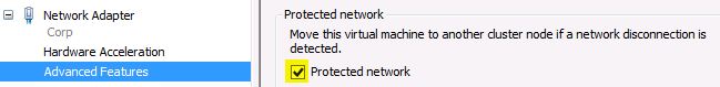 In Windows Server 2012 R2, there is now a Protected network check box in the virtual machine settings. This setting is available in the advanced features of the network adapter. By default, the setting is enabled. You can configure this setting on a per network basis for each virtual machine. Therefore, if there is a lower priority network such as one used for test or for backup, you can choose not to live migrate the virtual machine if those networks experience a network disconnection.